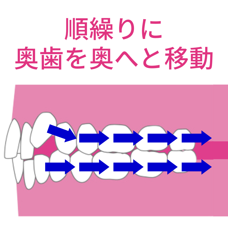 それにより空いたスペースに次の奥歯を動かし、さらに次の奥歯を動かします。