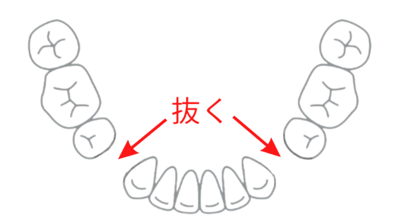 スペースを確保するために、抜歯が必要になることがあります。具体的には前から4番目の歯を抜いて、前歯を奥側へ引っ込めるスペースを生み出します。