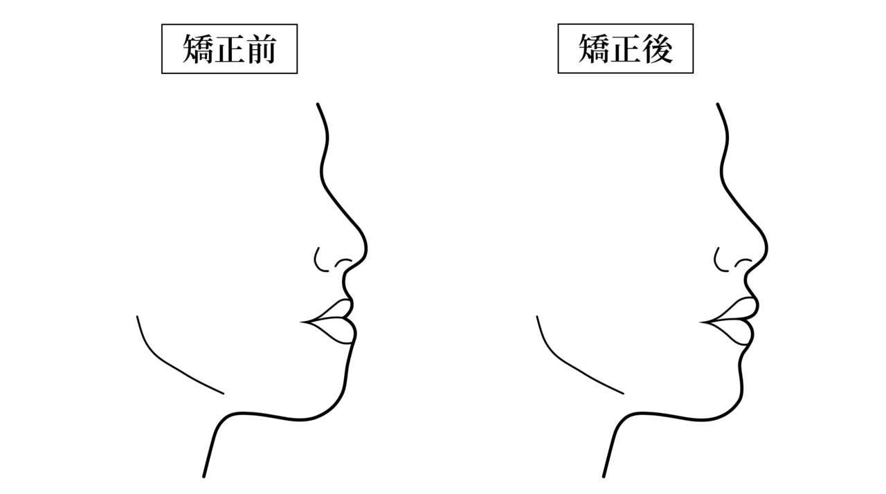 受け口の矯正治療により、下唇の位置が下がり、横顔のシルエット(Eライン)が整います。